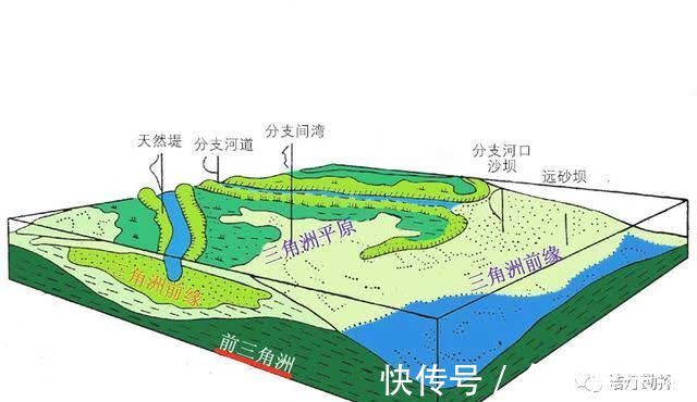 现代长江三角洲主要部分(南支汊道)(图源@Scenario Journal)三角洲平原亚相中的平原分流河道为水下分流河道由两侧河口坝堆积露出水面而逐渐发育形成。河口冲刷南岸, 在北岸沉积。主河道以细砂质沉积为主。
