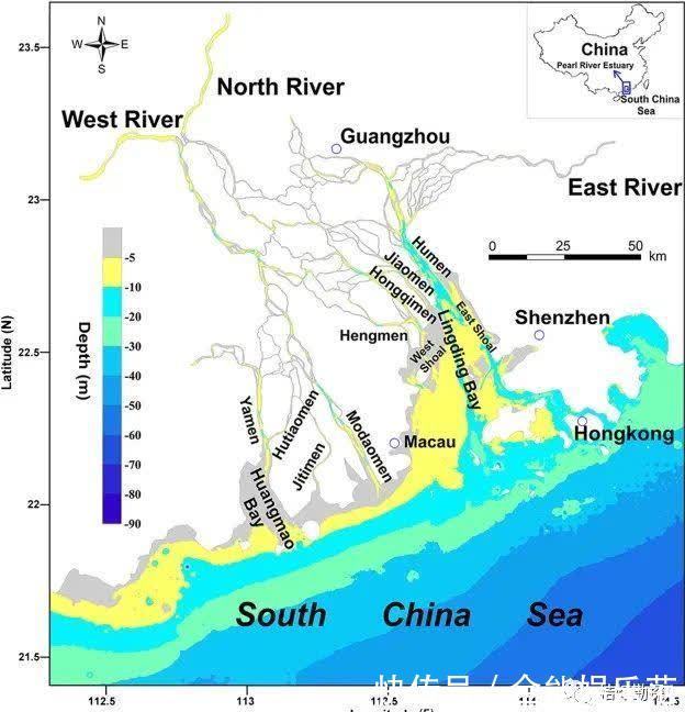 珠江三角洲平原(图源@中文百科全書)从水边线到-15m处的弧形区内,是镶嵌在三角洲平原外缘的三角洲前缘。该区水动力条件变化复杂,地形地貌多变,是沉积物堆积最为活跃的地段。