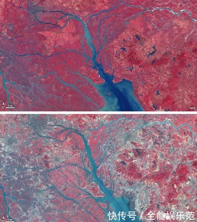 1973年(上)和2003年(下)的珠江三角洲(图源@NASA)三角洲平原由分流河道、分流间湾和滨岸沼泽等次一级环境组成。分流河道的沉积特征可以在相当大的范围内变化,一般为砂、砾质的高能沉积。