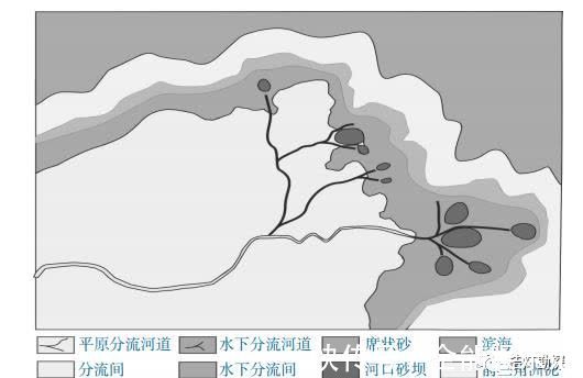 现代长江三角洲沉积相的发育模式(图源@文献[1])长江三角洲发育的10多个河口沙坝是其主要的地貌特征。河口沙坝呈梭状、透镜状分布在河口,尖部朝向陆地,以细砂质沉积为主。