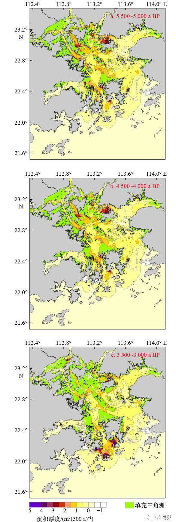 全新世海侵盛期以来若干阶段每 500 年沉积厚度图(图源@文献[13])其他相关沉积物粒度都比较小,属于低能沉积。具体情况因地而异,覆盖在三角洲前缘砂体之上。